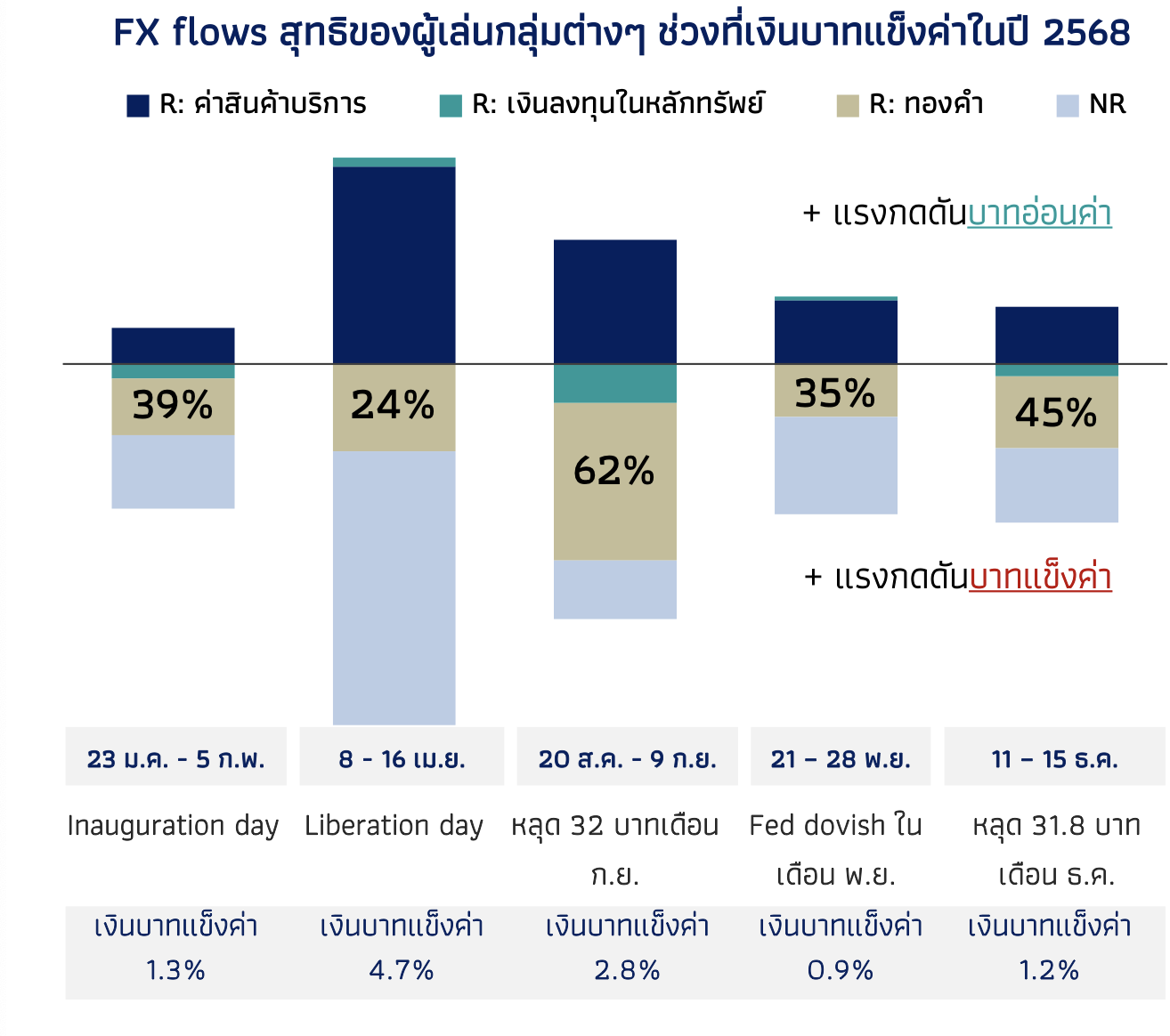 Drivers of Thai Baht Appreciation in 2025 The chart breaks down investment flows (including gold) that contributed to the baht’s rapid strengthening against the U.S. dollar across five key periods in 2025. Source: Bank of Thailand, February 2025