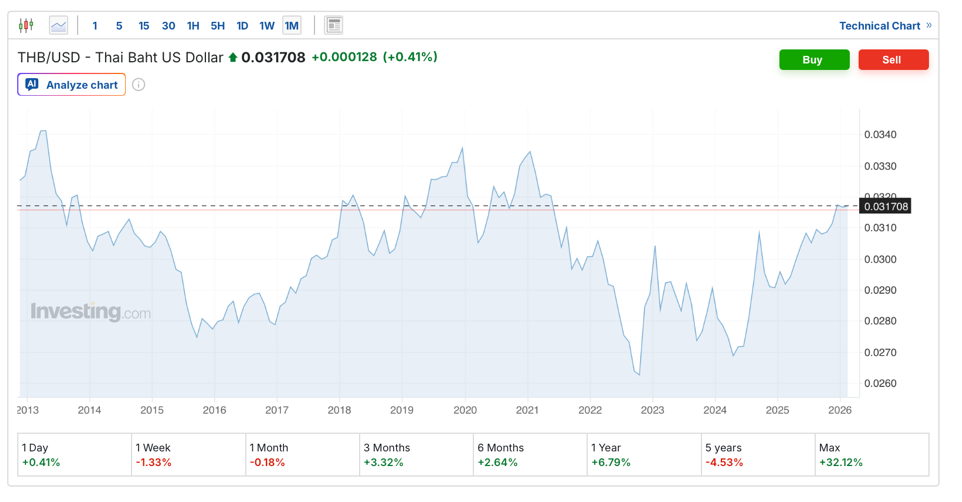 Thai Baht–USD Exchange Rate Trends (2013–2026) Source: https://th.investing.com/currencies/usd-thb